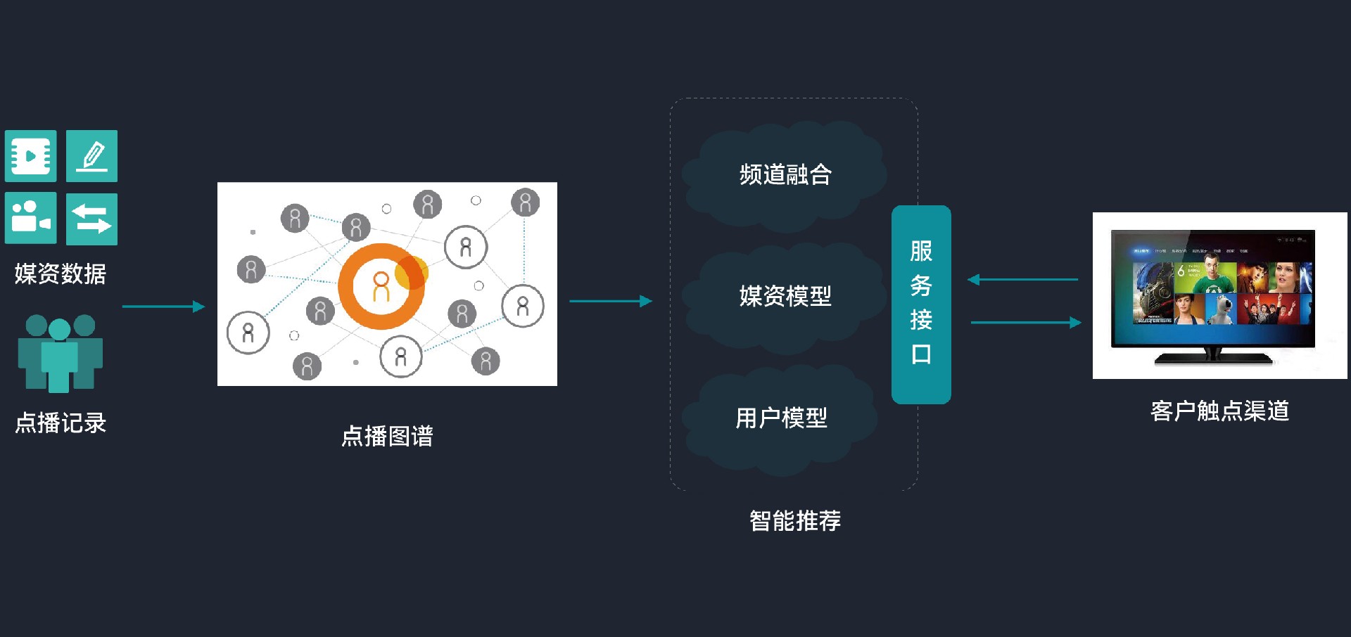 1. 在技术实现上,通过图数据库对媒资和点播记录多源数据进行抽取、融合,构建点播图谱,利用AI无监督推荐算法,通过端到端推荐模式实时向用户推荐视频内容。